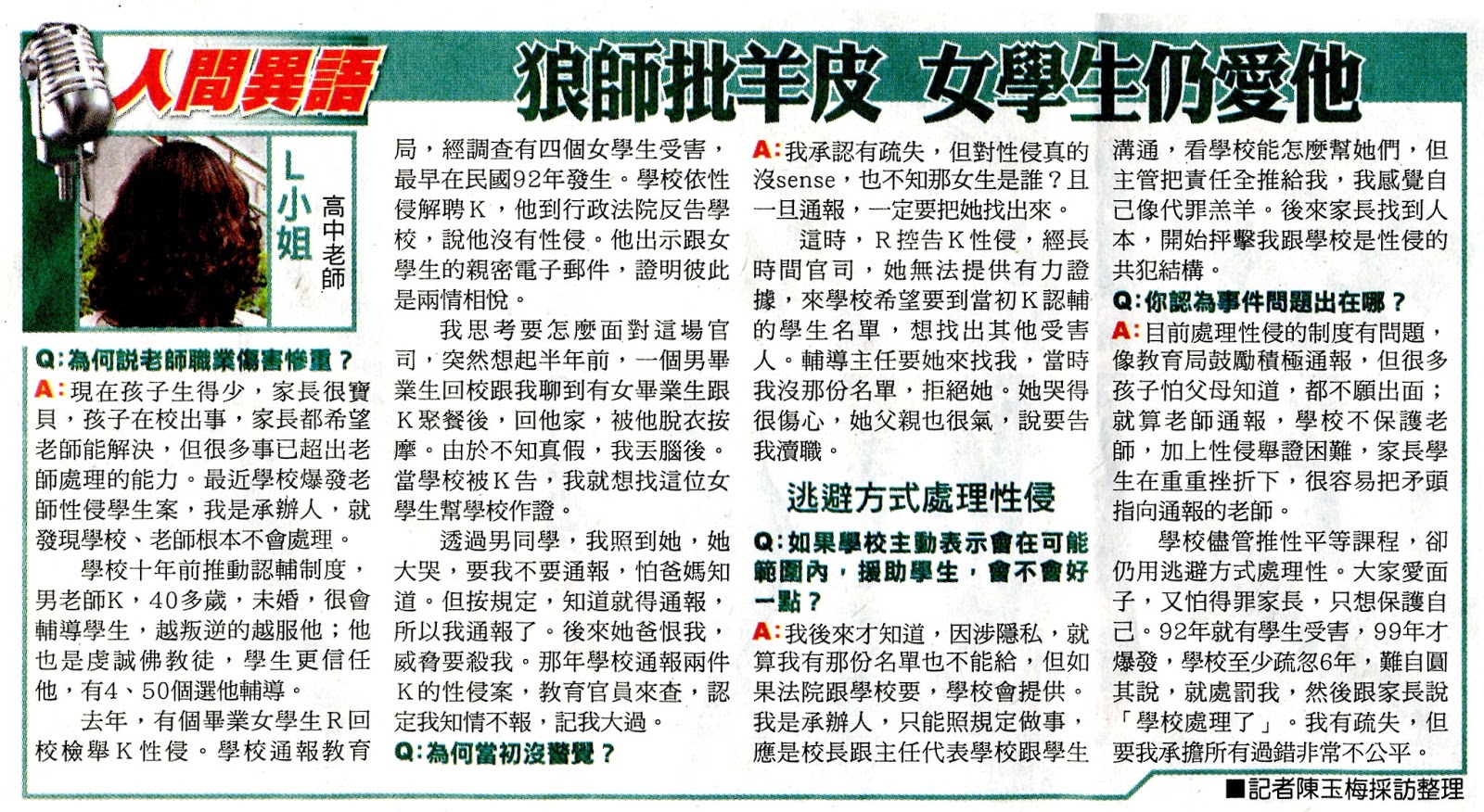 王姓輔導教師向媒體報料『狼師性侵,女學生仍愛她』,讓受害女學生心靈嚴重二度受傷!
